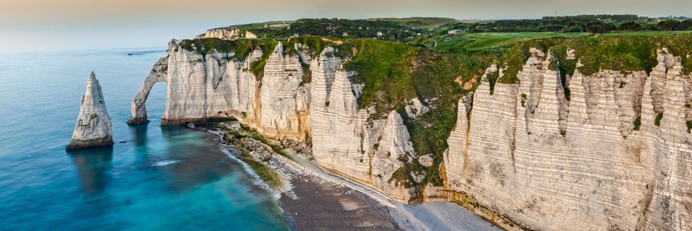 Atlantic Ocean has carved into the carbonate cliffs fabulous shapes at Étretat, Normandy, NW France, sometimes 90 m above sea level. Famous painters as Claude Monet, writers as Victor Hugo and movie directors as Luc Besson were amazed in front of the majestic landscape. The popularity of the "Étretat chalk complex", as it is known, made the multitude people that contemplate the great wall of chalk to rise the question about it's geological origin.